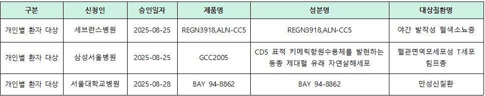 [치료목적 사용승인 정보] '25.8.25~8.29. 식약처 치료목적 사용승인 정보 안내