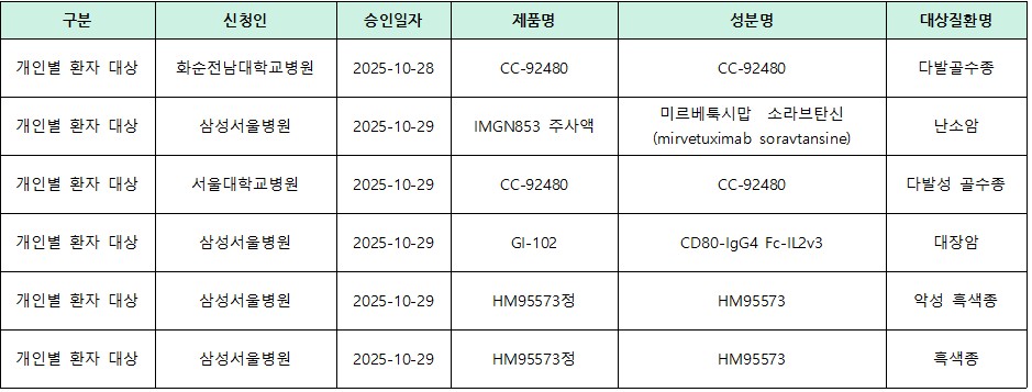 [치료목적 사용승인 정보] '25.11.3~11.7. 식약처 치료목적 사용승인 정보 안내
