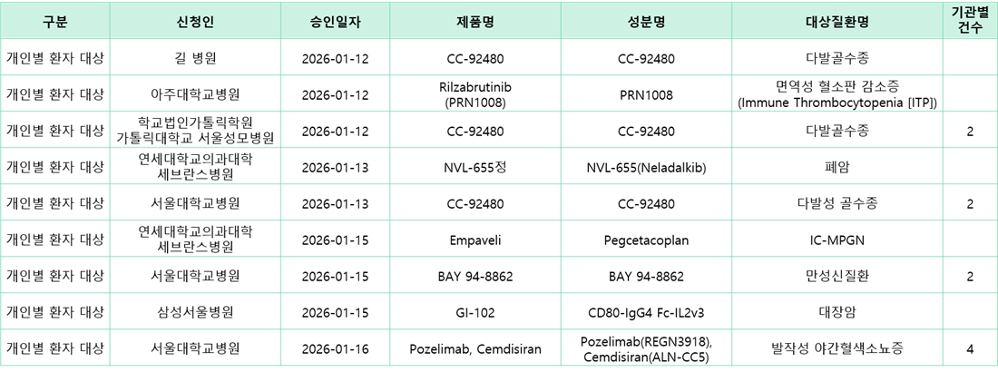 [치료목적 사용승인 정보] '26.01.03.~'26.01.11. 식약처 치료목적 사용승인 정보 안내