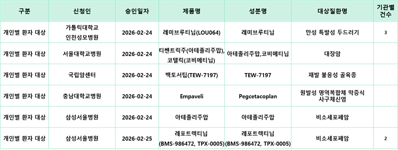 [치료목적 사용승인 정보] '26.02.23.~'26.03.01. 식약처 임상시험용의약품 치료목적 사용승인 정보