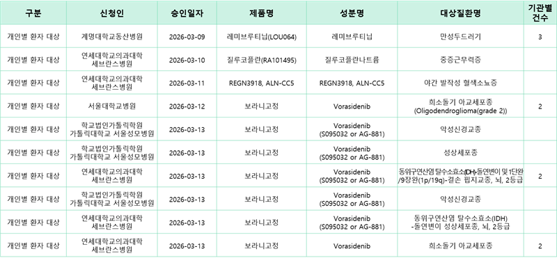 [치료목적 사용승인 정보] '26.03.09.~'26.03.15. 식약처 임상시험용의약품 치료목적 사용승인 정보