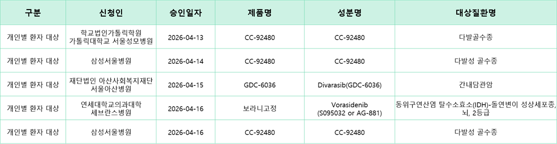 [치료목적 사용승인 정보] '26.04.06.~'26.04.13. 식약처 임상시험용의약품 치료목적 사용승인 정보