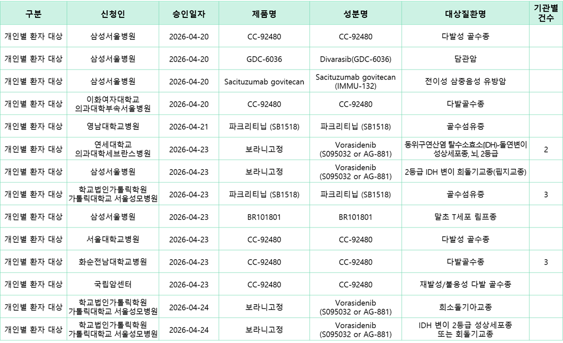 [치료목적 사용승인 정보] '26.04.20.~'26.04.26. 식약처 임상시험용의약품 치료목적 사용승인 정보