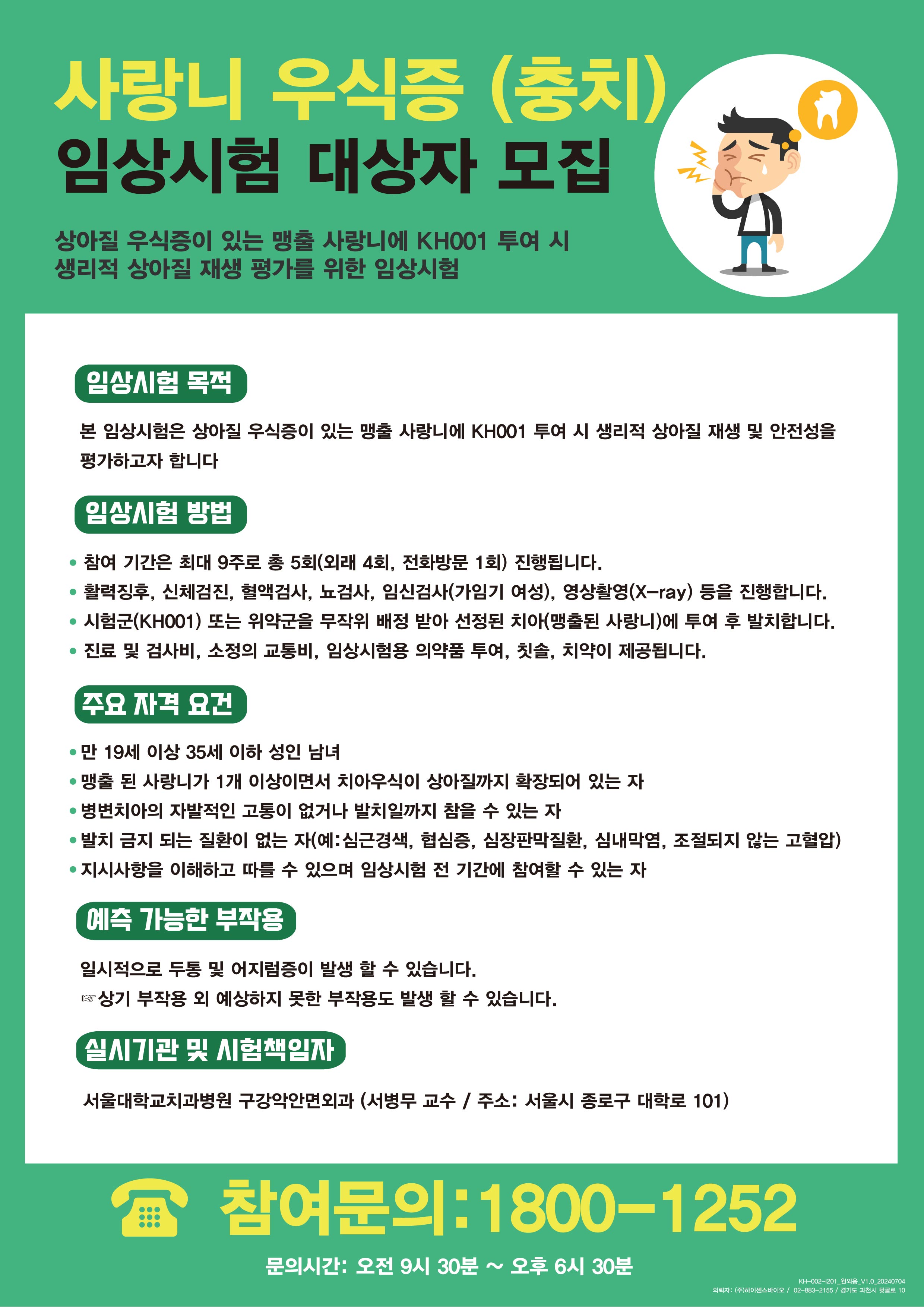 | 연구 제목 | 상아질 우식증이 있는 맹출 사랑니에 KH001 투여 시 생리적 상아질 재생 평가를 위한 임상시험 |